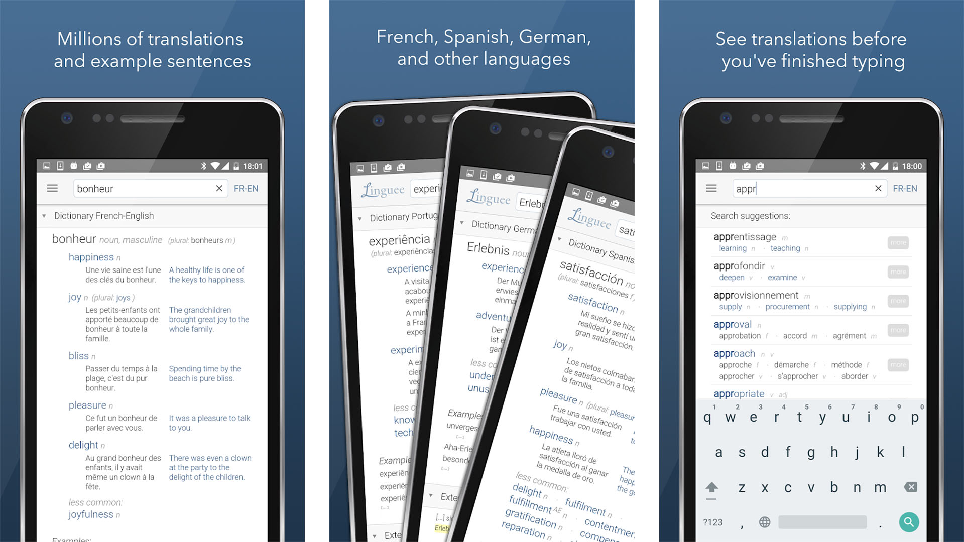 Dictionary Linguee는 인기 있고 강력한 다국어 사전입니다. 수십 개의 언어를 지원합니다. 이 앱에는 사용하기 쉬운 매우 멋진 UI도 포함되어 있습니다. 다른 기능으로는 오프라인 지원, 예문, 오디오 발음 등이 있습니다. 이것은 모바일에서 최고의 다국어 사전 중 하나입니다. 더 많은 언어를 지원했으면 합니다. 그러나 우리는 그것이 소리보다 더 어렵다고 확신합니다. 어쨌든 이 앱은 우리가 아는 한 광고나 인앱 구매 없이 완전히 무료입니다. 확실히 최고 중 하나입니다.