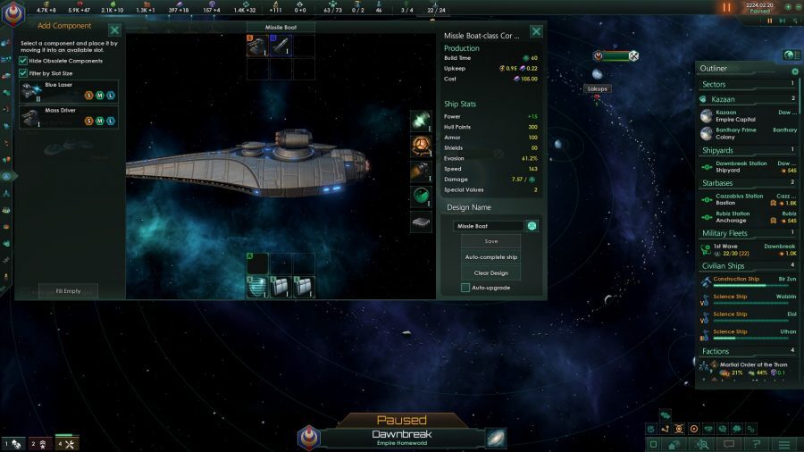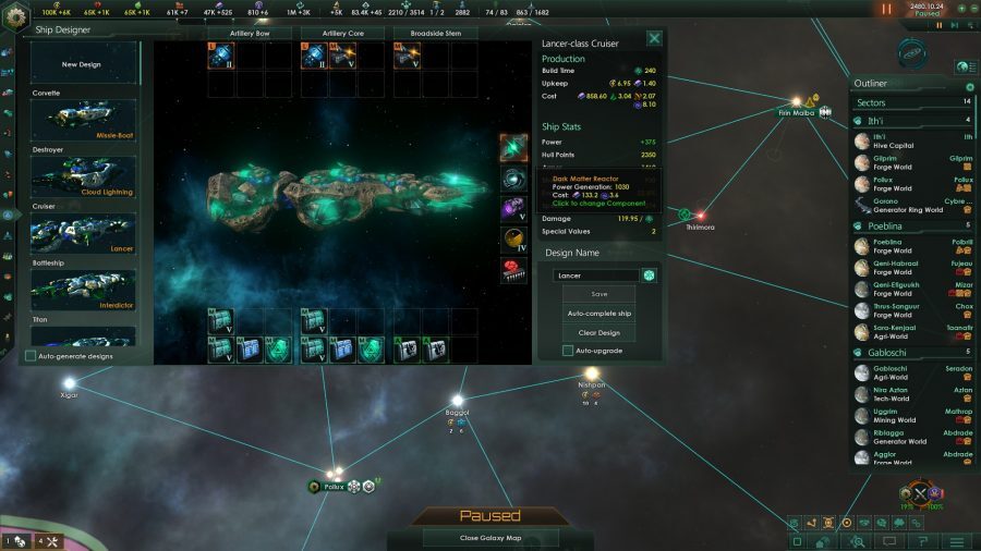 또한 선박의 초기 비용과 유지 비용을 기록해 두십시오. 함선 설계자의 오른쪽에 표시되는 비용은 더 이국적인 유형의 재료를 포함하는 후반 게임 디자인과 함께 합금과 에너지로 분류됩니다. 실제로 지원할 수 없는 것을 만들고 싶지 않으니 이를 주시하십시오.