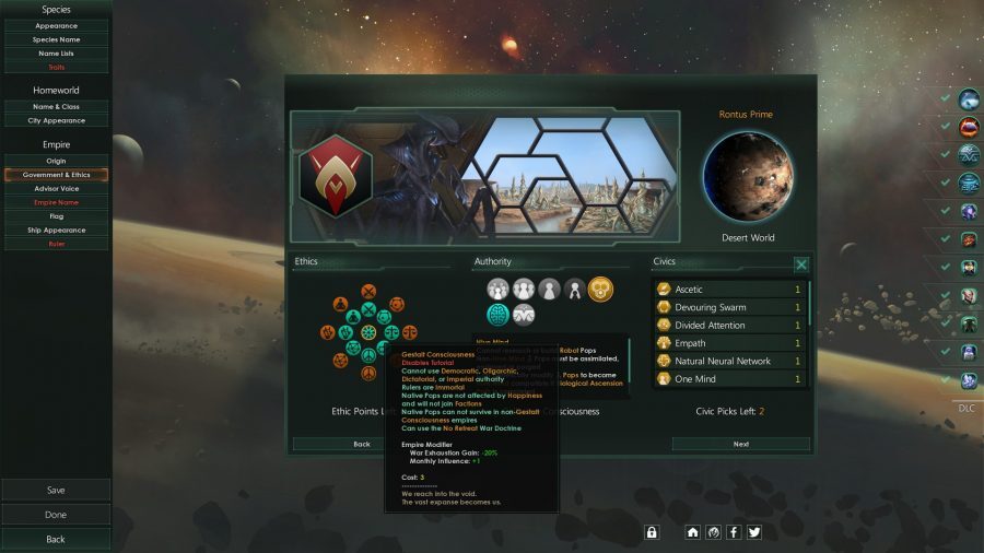 그들은 또한 의도적으로 기본 역학의 일부와 교전하지 않습니다. 우리는 하이브마인드가 소비재를 사용하지 않고 주로 음식과 그 응용에 초점을 맞추고 있으며 기계 제국은 음식을 사용하지 않고 대신 광물에서 인구를 모으고 더 많은 에너지 소비로 지원한다는 사실을 이미 언급했습니다. 게슈탈트 제국을 선택함으로써 당신은 당신의 경험에서 그 게임 플레이를 제거하기 위해 의식적으로 선택합니다. 마찬가지로 대부분의 유형의 게슈탈트 제국은 다른 유형의 인구와 같은 행성에 공존할 수 없기 때문에 다중 종 인구 통계 관리도 포기합니다. (시민을 신중하게 선택하는 예외가 있으며 게임 후반에는 불쌍한 희생자를 사이보그하거나 유전적으로 변형할 수 있는 능력이 있는 경우 항상 강제 동화가 발생합니다.)