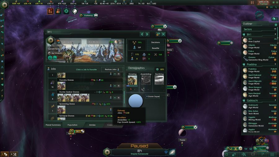 지구의 전체 인구에 대한 주택 및 일자리 수와 지구 및 건물의 균형을 유지하는 것은 그 자체로 매우 미니 게임입니다. 주택이나 일자리에 대한 팝이 너무 많으면 행성은 이주 압력을 경험하고 사람들은 주택이 열려 있거나 인구에 비해 일자리가 너무 많은 다른 행성으로 이동하는 경향이 있습니다. 또는 이주 조약이 있는 경우 완전히 다른 제국으로 이동하는 경향이 있습니다. .