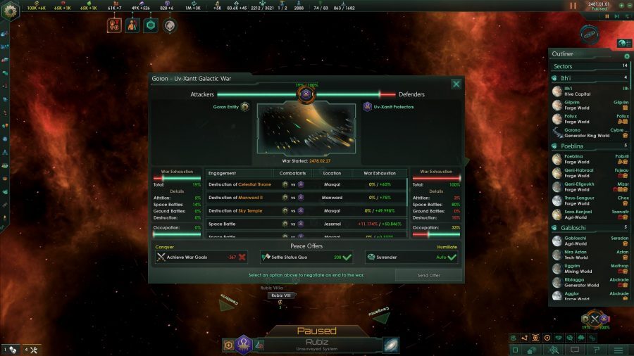 전쟁은 몇 가지 구성 요소로 나뉩니다. 주장을 한다는 것은 적의 영토를 주장하기 위해 당신의 영향력을 사용하는 것과 관련이 있습니다. 주장하는 시스템이 당신의 영토에서 멀어질수록 더 많은 영향력을 행사하게 됩니다. 공격하기 전에 통신 패널을 통해 전쟁을 선포해야 합니다. 전쟁이 선포되면 어떤 종류의 전쟁이 될 것인지에 따라 전쟁 목표를 설정해야 합니다. 가장 일반적인 것은 정복입니다. 가신화, 해방 또는 모욕과 같은 다른 옵션이 발생할 수 있습니다. 목표를 달성하면 전쟁에서 승리합니다.
