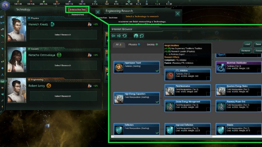 Stellaris의 기술 인터페이스는 엔지니어링, 물리학 및 사회의 각 핵심 분야에 대해 하나씩 세 개의 섹션으로 나뉩니다. 어떤 기술이 표시되는지에 대한 내장된 편견과 함께 각 영역에 대해 무작위로 뽑은 3개의 기술로 시작합니다. 기술을 연구할 때마다 특정 편향에 따라 새로운 기술이 무작위로 선택됩니다. 이벤트를 통해 무언가를 발견하거나 잠금 해제하면 이 인터페이스에도 표시되며 조사할 때까지 그대로 유지됩니다.