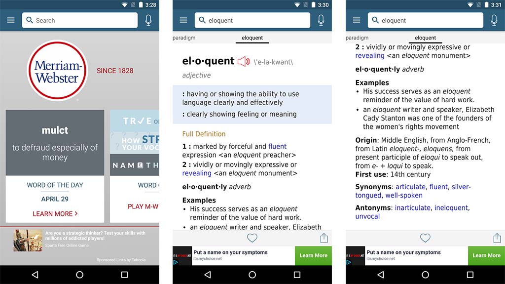 Merriam-Webster Dictionary는 가장 잘 알려진 사전 앱 중 하나입니다. 이름 인식만으로도 매우 인기가 있습니다. 고맙게도 기능도 풍부합니다. 표준 단어 정의 외에도 이 앱은 어휘를 늘리기 위한 단어 게임을 제공합니다. 또한 통합 동의어 사전, 예문, 오디오 발음, 오늘의 단어 등을 제공합니다. 무료 버전은 앱으로 가득 차 있지만 $2.99 버전은 그렇지 않습니다. 공격적인 광고 외에도 앱은 전반적으로 꽤 괜찮습니다.