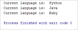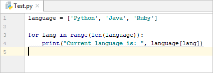 for lang in range(len(language)): print(“Current language is: “, language[lang]) |