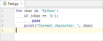 for char in ‘Python’: if (char == ‘h’): pass print(“Current character: “, char) |