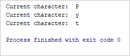 위의 예에서 두 번째 반복 동안 조건이 true로 평가되면 continue 문을 실행합니다. 따라서 아래에있는 모든 명령문은 for 루프를 건너 뛰므로 문자 'y'가 인쇄되지 않습니다.