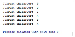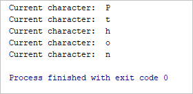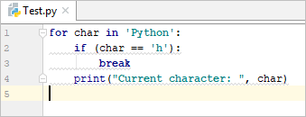 for char in ‘Python’: if (char == ‘h’): break print(“Current character: “, char) |
