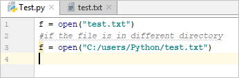 #if the file is in the same directory f = open(“test.txt”) #if the file is in a different directory f = open(“C:/users/Python/test.txt”) |