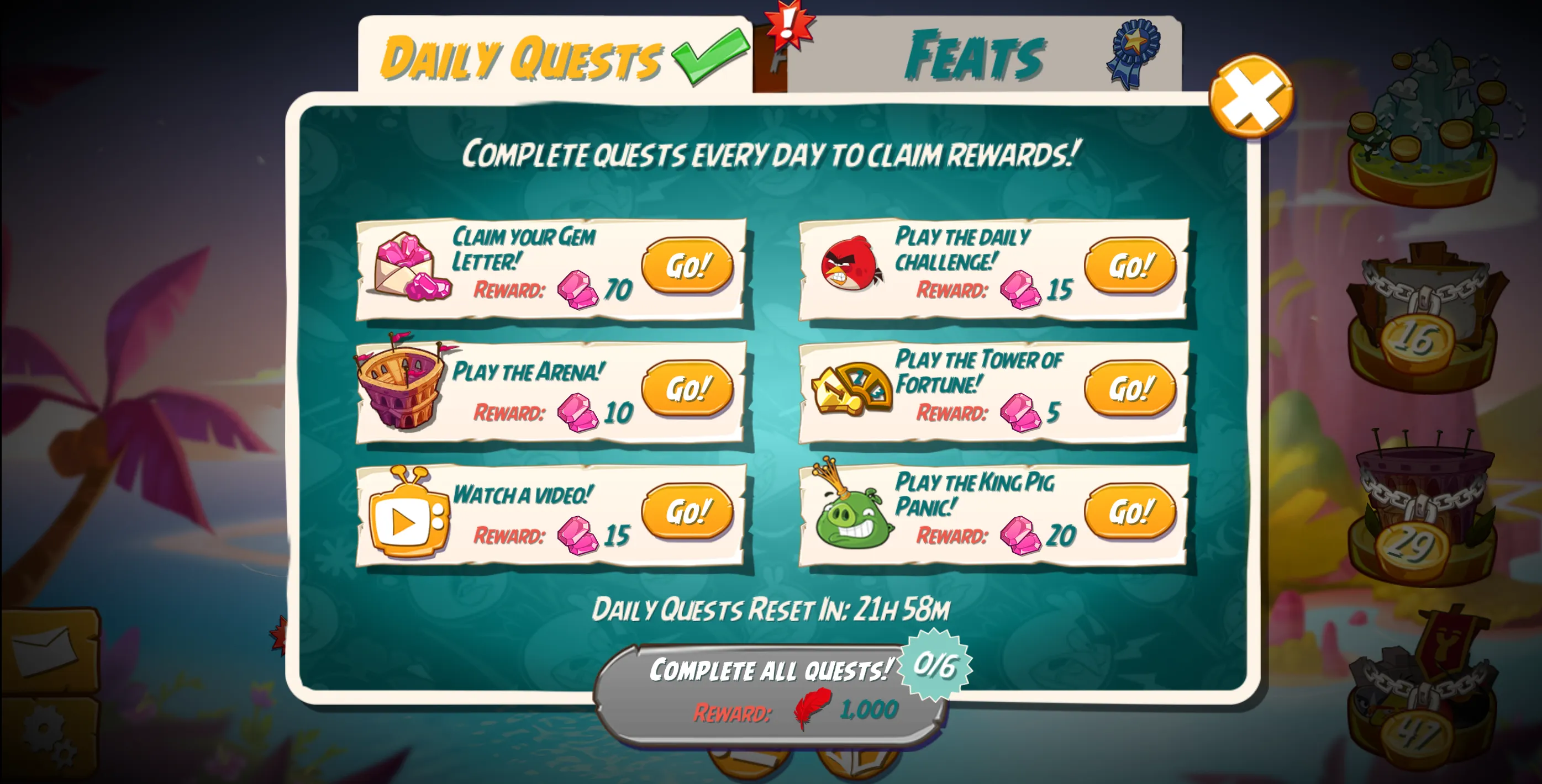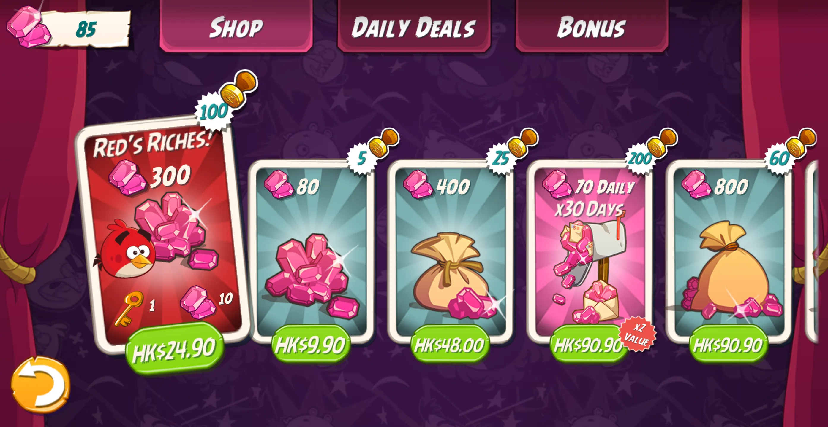 보석에는 세 부분이 있으며 상점, 일일 거래 및 보너스입니다. 보석이 충분하면 5개의 무료 생명을 잃고 희귀한 보물을 얻을 때 수많은 생명을 살 수 있습니다. 실제로 Angry Birds 2에서는 플레이어가 비용을 지불하지 않고도 보석을 얻을 수 있습니다.