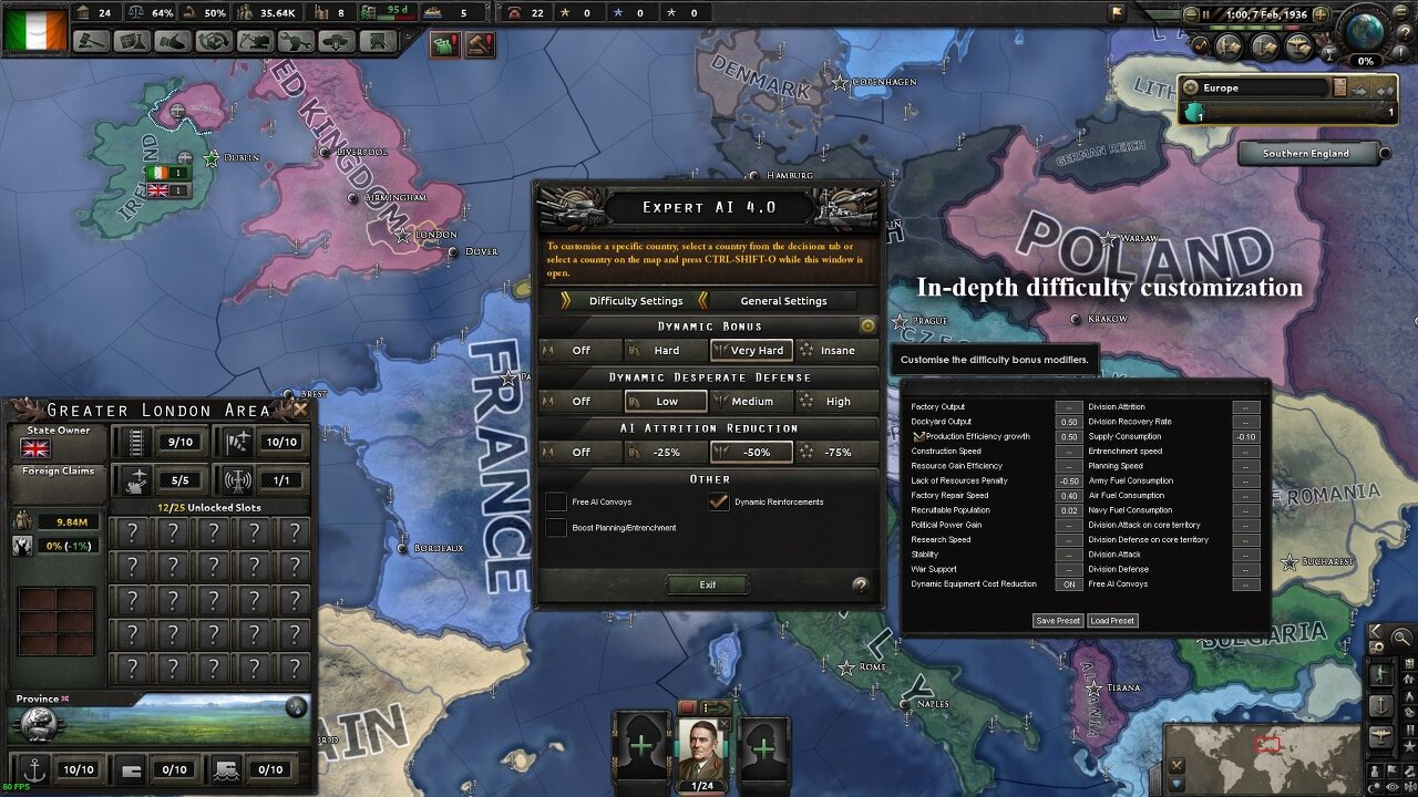 전문가 AI 는 특히 1936년에 역사적 초점 모드를 켠 상태에서 시작하면서 AI를 플레이어에게 더 도전적인 상대로 만들기 위해 많은 비하인드 씬 작업을 수행합니다. 모든 것을 해결할 수는 없지만 광범위한 AI 행동 및 의사 결정 시스템을 다루어 컴퓨터 상대가 더 똑똑하고 열심히 싸울 수 있도록 합니다. 또한 소규모 국가를 플레이하는 동안에는 이 모드를 사용하지 않는 것이 좋습니다.