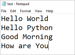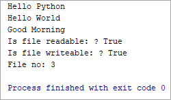 my_file = open(“C:/Documents/Python/test.txt”, “w+”) my_file.write(“Hello Python\nHello World\nGood Morning”) my_file.seek(0) print(my_file.read()) print(“Is file readable: ?”, my_file.readable()) print(“Is file writeable: ?”, my_file.writable()) print(“File no:”, my_file.fileno()) my_file.close() |