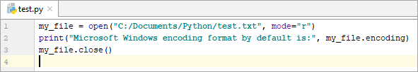 my_file = open(“C:/Documents/Python/test.txt”, mode=”r”) print(“Microsoft Windows encoding format by default is:”, my_file.encoding) my_file.close() |