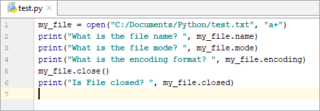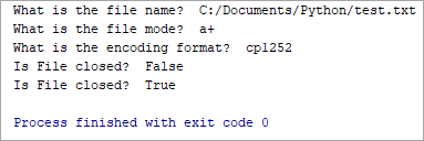 my_file = open("C:/Documents/Python/test.txt", mode="w+") print("What is the file name? ", my_file.name) print("What is the mode of the file? ", my_file.mode) print("What is the encoding format?", my_file.encoding)