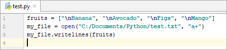 text = ["Hello Python\n", "Good Morning\n", "Good Bye"] my_file.writelines(text)