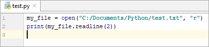 my_file = open(“C:/Documents/Python/test.txt”, “r”) print(my_file.readline(2)) |