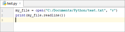 my_file = open(“C:/Documents/Python/test.txt”, “r”) print(my_file.readline()) |