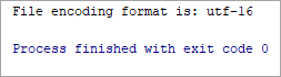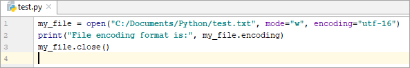 my_file = open(“C:/Documents/Python/test.txt”, mode=”w”, encoding=”utf-16”) print(“File encoding format is:”, my_file.encoding) my_file.close() |