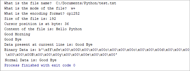 bin_file = open("C:/Documents/Python/bfile.exe", mode="wb+") message_content = data.encode("utf-32") bin_file.write(message_content) bin_file.seek(0) bdata = bin_file.read() print("Binary Data is:", bdata) ndata = bdata.decode("utf-32") print("Normal Data is:", ndata) file.close() bin_file.close() |