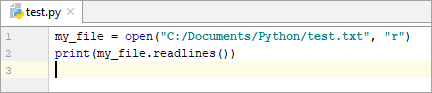 my_file = open(“C:/Documents/Python/test.txt”, “r”) print(my_file.readlines()) |