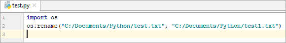 import os os.rename(“C:/Documents/Python/test.txt”, “C:/Documents/Python/test1.txt”) |