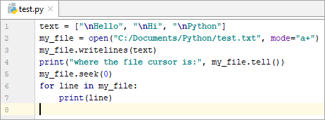위의 예에서는 'C : / Documents / Python /'위치에있는 'test.txt'라는 파일을 열고 더 많은 유연성을 제공하는 읽기-쓰기 모드로 동일한 파일을 엽니 다.