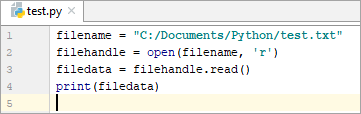 my_file = open(“C:/Documents/Python/test.txt”, “r”) print(my_file.read()) |