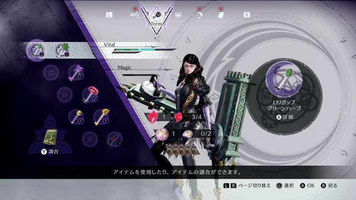 다만, 번거롭게 되었다고 해도, 각종 롤리팝 캔디를 비롯해, 이 게임에서는 아이템 사용을 그다지 망설이지 않는 편이 좋다. 라고 하는 것도, 제1작 「베요네타」에서는 아이템의 소지수가 소량으로, 아이템을 사용한 횟수에 의해 스코어가 감점되는 요소도 있었지만, 이번 작품에서는 과거작 이상으로 아이템을 가질 수 있는 것에, 아이템 사용으로 인한 점수 감점도 발생하지 않는다.