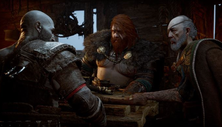 이야기 시작, 크레이토스들과 밀회하는 오딘과 토르. 이 게임에서는 전작시에 등장하지 않았던 북유럽 신화의 신들이 잇달아 등장한다.