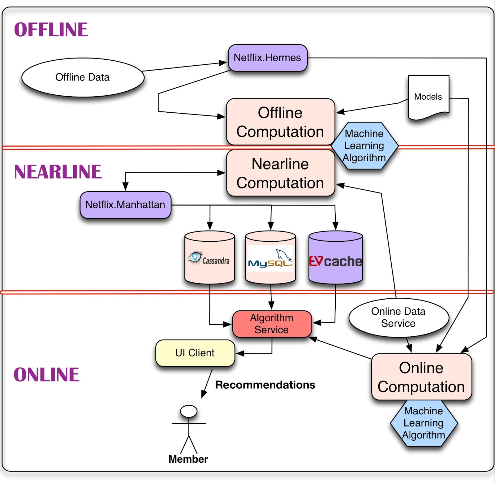 추천을 수행하는 방법에는 세 단계가 있습니다. (Netflix Technology Blog, 2017)에서 오프라인 계산은 데이터에 적용되며 사용자의 실시간 분석과는 관련이 없습니다. 실행 시간이 완화되고 알고리즘은 고정 된 시간 간격으로 처리 할 데이터 양에 대한 부담없이 일괄 적으로 훈련됩니다. 그러나 최신 정보를 통합하려면 자주 교육을 받아야합니다. 모델 학습 및 결과 배치 계산과 같은 작업은 오프라인으로 수행됩니다. 그들은 많은 데이터를 다루기 때문에 Pig 또는 Hive를 통해 Hadoop에서 실행하는 것이 좋습니다.