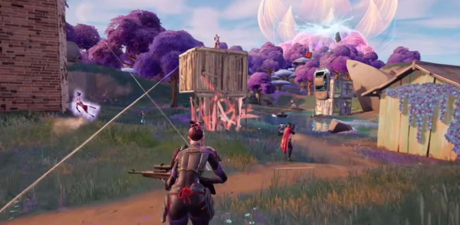 플레이어는 Fortnite에서 최고의 사격을 가하는 적 플레이어와 함께 지어진 요새를 향해 달리기 시작합니다.