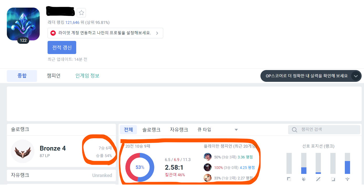 바로 전적 검색 결과가 보여지고, 승률 및 선호포지션, 킬관여 기여도까지 한번에 보여주게 됩니다!