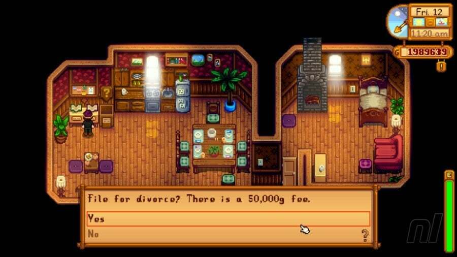 루이스 시장은 또한 업데이트 1.1부터 그의 집에 새로운 기능인 이혼 책을 가지고 있습니다. 이 책을 통해 50,000G로 배우자와 이혼할 수 있습니다. 이것은 그 NPC를 제로 하트로 되돌리고 그들의 관계를 "ex"로 변경하고 그들은 또한 미래에 당신의 결혼 실패에 대해 언급할 것입니다. 배우자의 기억을 지우기 위해 마녀의 오두막을 사용하는 것보다 훨씬 비싸고 훨씬 어렵습니다. 하지만 아마도 더 친절할 것입니다.