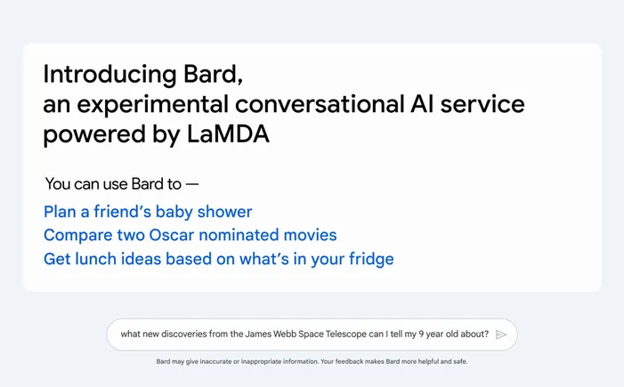 Pichai는 또한 Bard가 "신선하고 고품질의 응답을 제공하기 위해 웹에서 정보를 가져옵니다"라고 말하면서 ChatGPT가 어려움을 겪고 있는 최근 이벤트에 대한 질문에 답변할 수 있을 수 있음을 시사합니다.