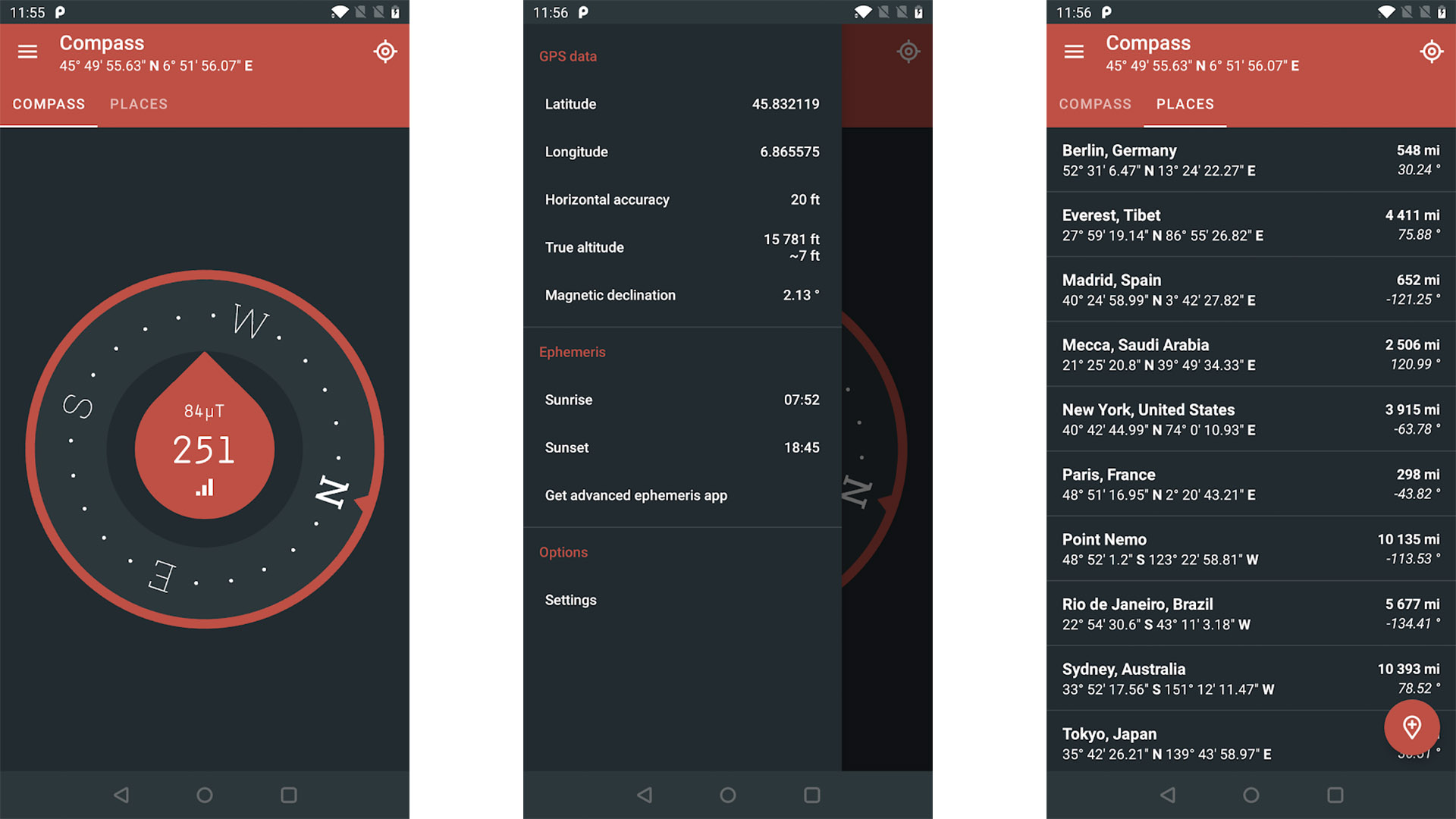 Fulmine Software는 괜찮은 기본 나침반 앱을 제공하는 Google Play의 개발자입니다. 그것은 일반적인 기능을 자랑하며 GPS 또는 데이터 연결 없이 작동합니다. 또한 자기 및 실제 방향과 함께 방향이 포함된 지속적인 알림을 받습니다. 물론 GPS를 사용하면 조금 더 잘 작동하지만 모든 나침반은 실제로 그래야 합니다. 무료 및 프리미엄 변형 모두 위도 및 경도 좌표와 같은 깔끔한 항목과 함께 사실상 권한이 없습니다.
