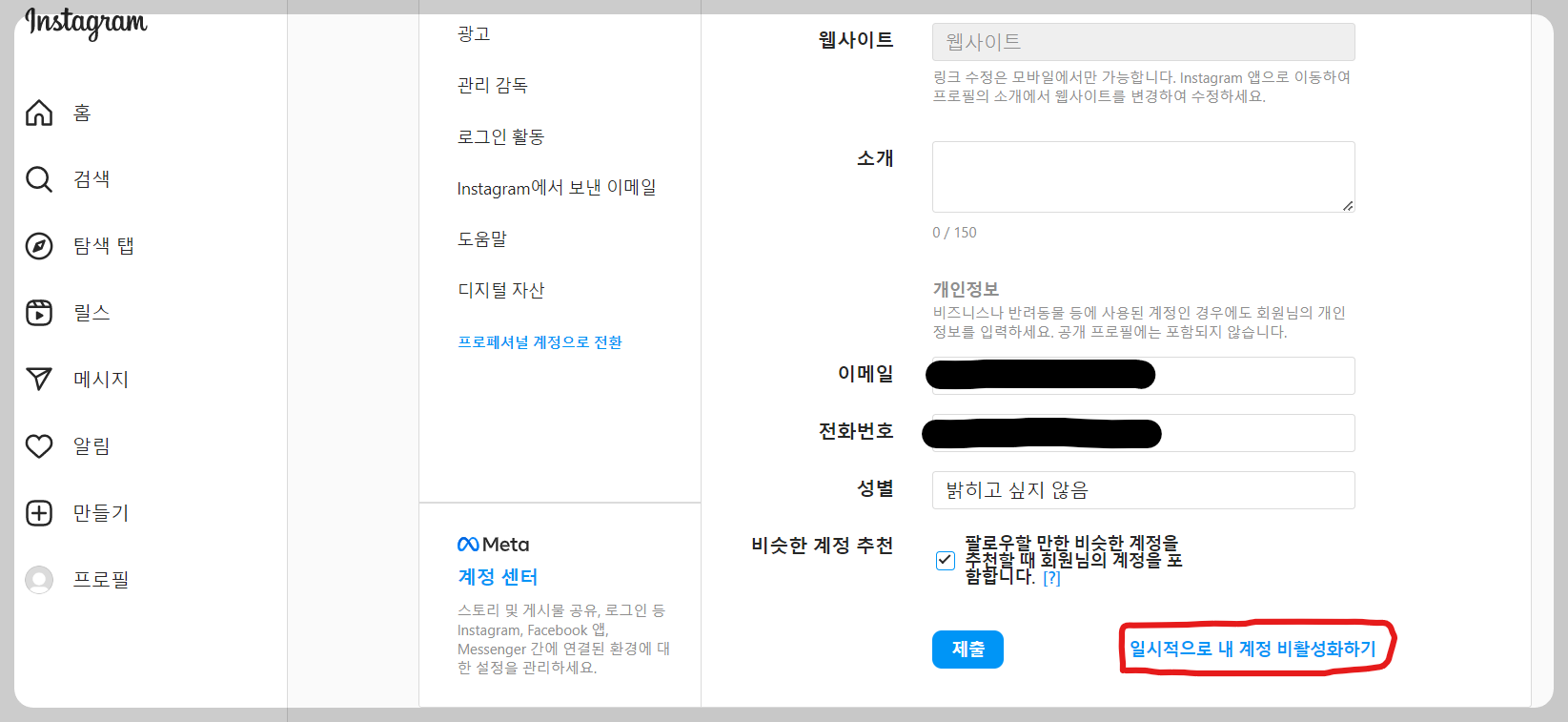 인스타 계정 비활성화 (임시)