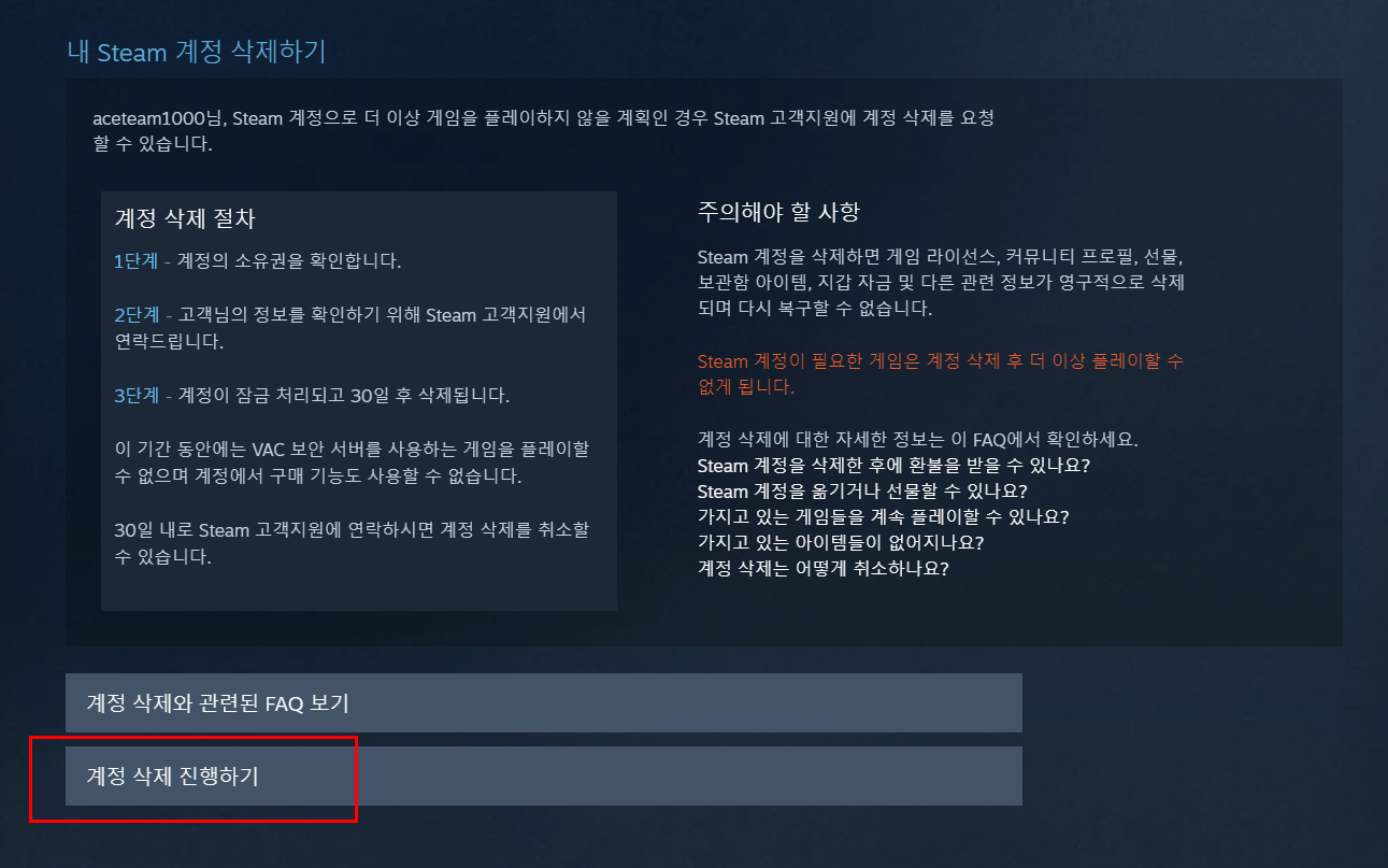 계정을 삭제하면 스팀을 통해 구매한 모든 게임 및 게임 라이선스도 삭제됩니다.