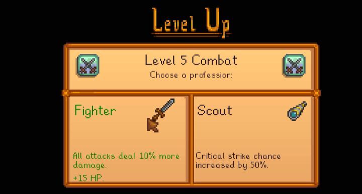 - 레벨 5 - 파이터와 스카우트 직업 중에서 선택하십시오. 파이터는 데미지를 10% 더 증가시키고 최대 HP를 +15 증가시키며, 스카웃은 치명타 확률을 기본보다 50% 증가시킵니다 .