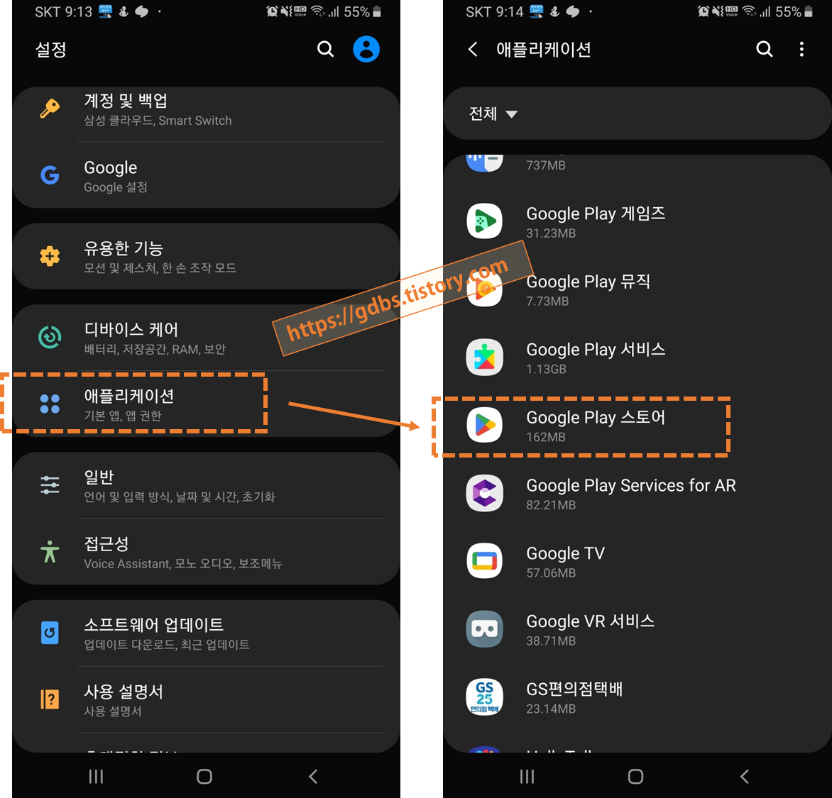 2. 어플리케이션을 눌러 나오는 목록들 중에서 "Google Play 스토어"를 선택합니다.