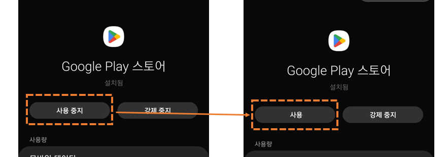 2. 구글 플레이 스토어 '사용중지'를 '사용'으로 변경