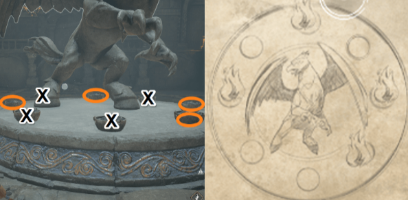 은신처 내부의 히포그리프 조각상에 대한 퍼즐을 풀기 위해서는 지도의 그림에 따라 올바른 횃불을 밝혀야 합니다.