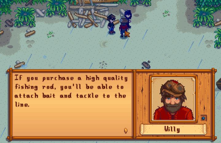 Willy는 당신에게 첫 낚시대를 줄 것입니다. 그는 또한 나중에 유리 섬유 낚싯대를 얻었을 때 미끼를 살 수 있는 생선 가게를 운영합니다.