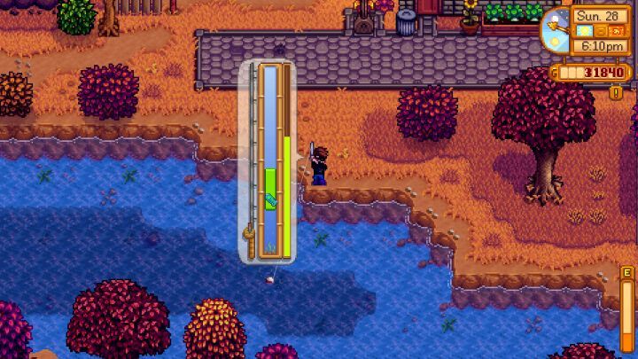 이러한 일반적인 질문에 도움이 되는 두 개의 가이드를 작성했으므로 여기에서 자세히 반복할 이유가 없습니다. 해안으로 올라가서 낚시를 하려면 낚싯대를 사용하여 낚싯대를 던지고(최대에 가까울수록 좋음) 낚시 미니 게임을 플레이하세요. 목표는 물고기를 녹색 사각형(버튼을 클릭한 상태로 유지하여 제어하는 것) 안에 유지하는 것입니다. 안정적으로 유지하기 위해 빠르게 클릭해야 하는 경우와 위쪽으로 빠른 샷을 위해 유지해야 하는 경우를 배우는 것이 중요합니다. 낚시에 문제가 있는 경우 Stardew Valley에서 낚시하는 방법을 참조하세요 . 미끼 사용법은 인벤토리 화면에서 미끼를 '줍고' 장대 위에 마우스를 올려 우클릭하면 장착된다. Xbox 컨트롤러로 비슷한 작업을 수행합니다.