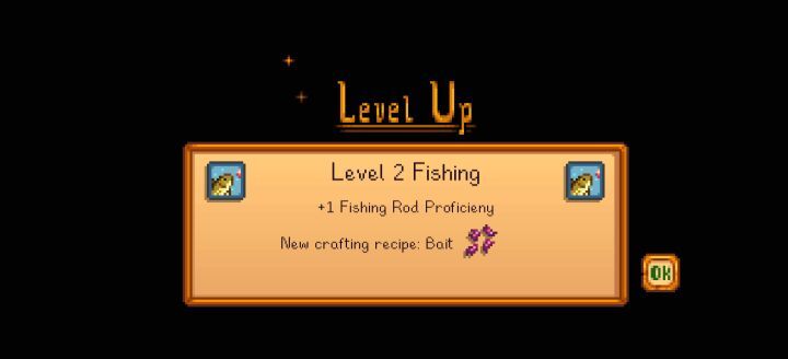 낚시 숙련도는 물고기를 잡으면 얻을 수 있습니다. 레벨을 올리면 낚시를 최대한 활용하는 데 도움이 되는 몇 가지 고유한 것뿐만 아니라 미끼와 태클을 만드는 방법을 배웁니다. 잠금 해제한 미끼는 사용 가능해지면 윌리에게서 구입할 수 있습니다.