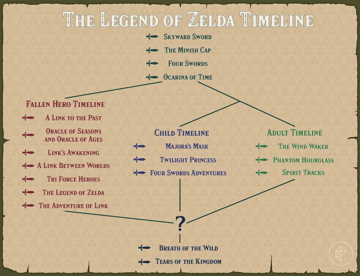 고맙게도 2011년에 The Legend of Zelda: Hyrule Historia에서 처음으로 공식적으로 게시된 타임라인을 얻었습니다. (젤다 시리즈의 크리에이티브 팀은 2003년 이전에 비공개 버전의 타임라인을 가지고 있었습니다.) 이 공식 타임라인은 게임을 세 가지 가능한 결과로 분기되는 응집력 있는 타임라인으로 재정렬합니다.