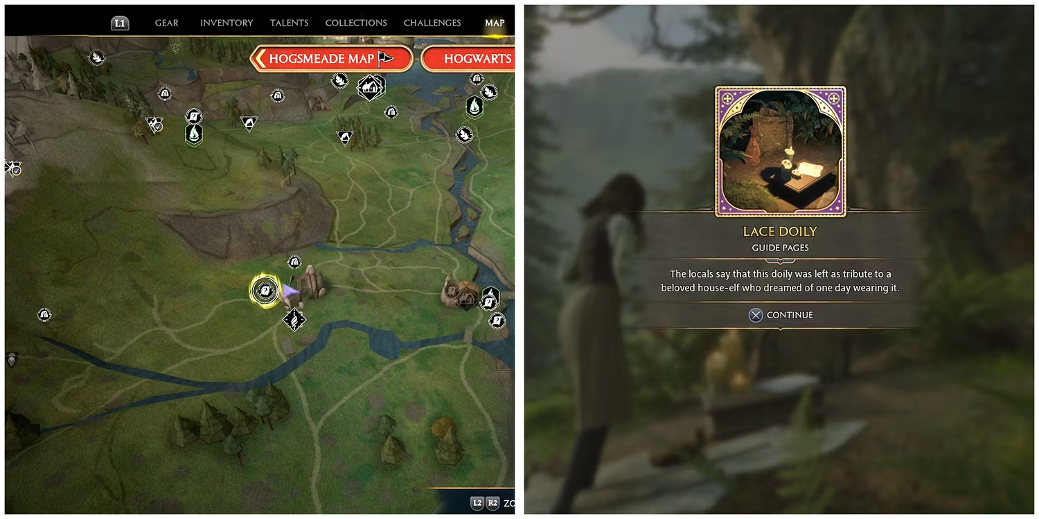 첫 번째 필드 가이드 페이지는 호그와트 레거시의 Keenbridge Floo Flame 서쪽에서 찾을 수 있습니다 . 플레이어가 폐허에 도착하면 거대한 나무 앞의 묘비로 가서 Revelio를 사용하여 Lace Doily Field Guide Page를 수집하십시오 . 소장품에는 다음과 같이 적혀 있습니다.