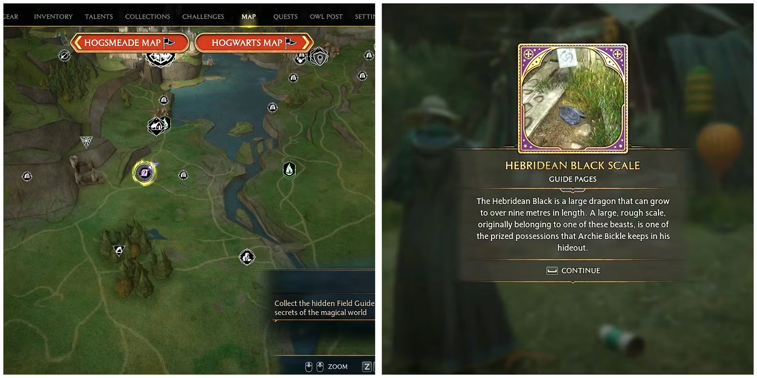 일곱 번째 Field Guide Page는 Lower Hogsfield Floo Flame 남쪽에서 찾을 수 있습니다. Archie의 텐트로 가서 Revelio를 캐스팅 하여 다음과 같은 Hebridean Black Scale 수집품을 찾습니다 . 원래 이 야수 중 하나에 속했던 크고 거친 비늘은 Archie Bickle이 자신의 은신처에 보관하는 귀중한 소유물 중 하나입니다.”