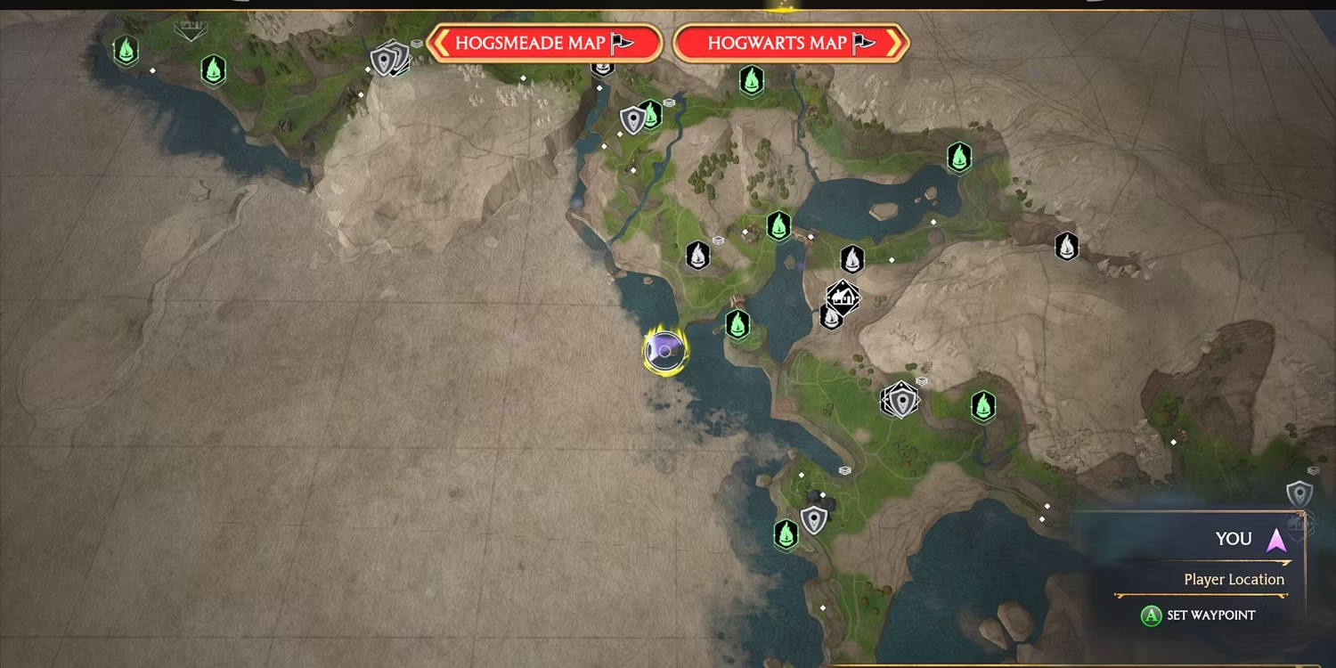 4. 남쪽 호그와트 지역의 Aranshire Floo Flame 남쪽 , 호그와트 남동쪽에 있는 일부 절벽에 있습니다. 상륙 플랫폼은 지도에 표시된 보물 창고의 서쪽입니다.