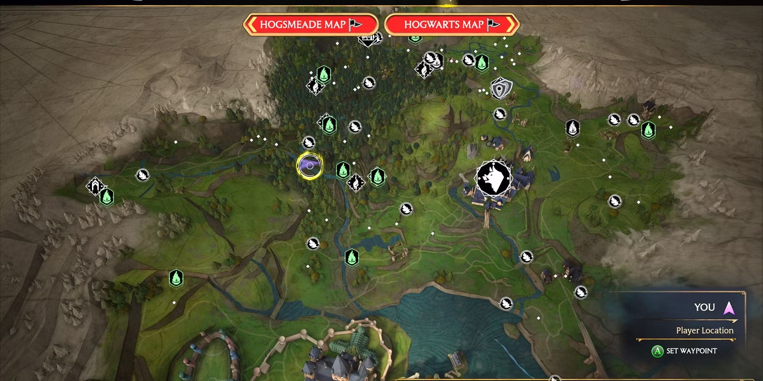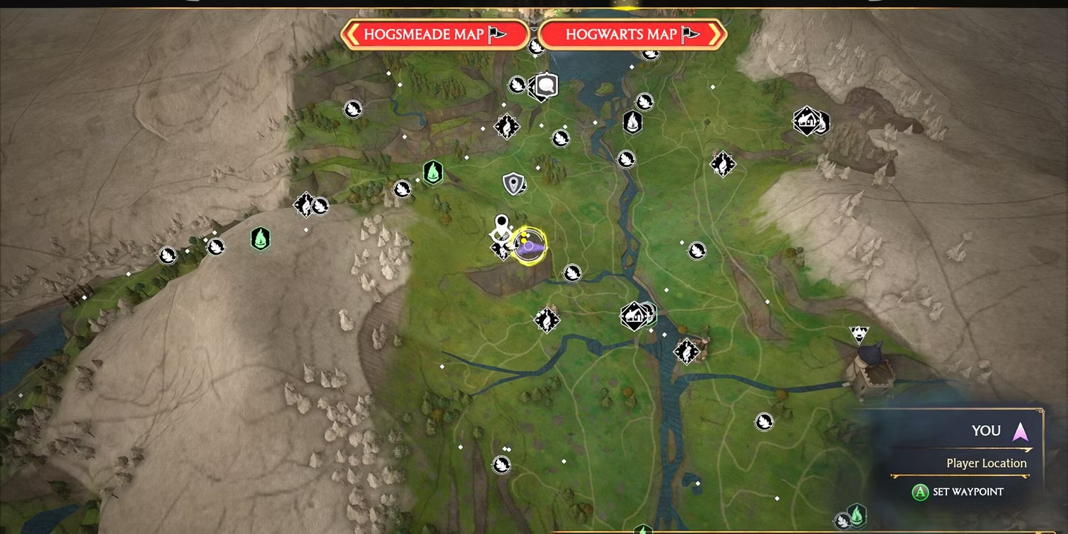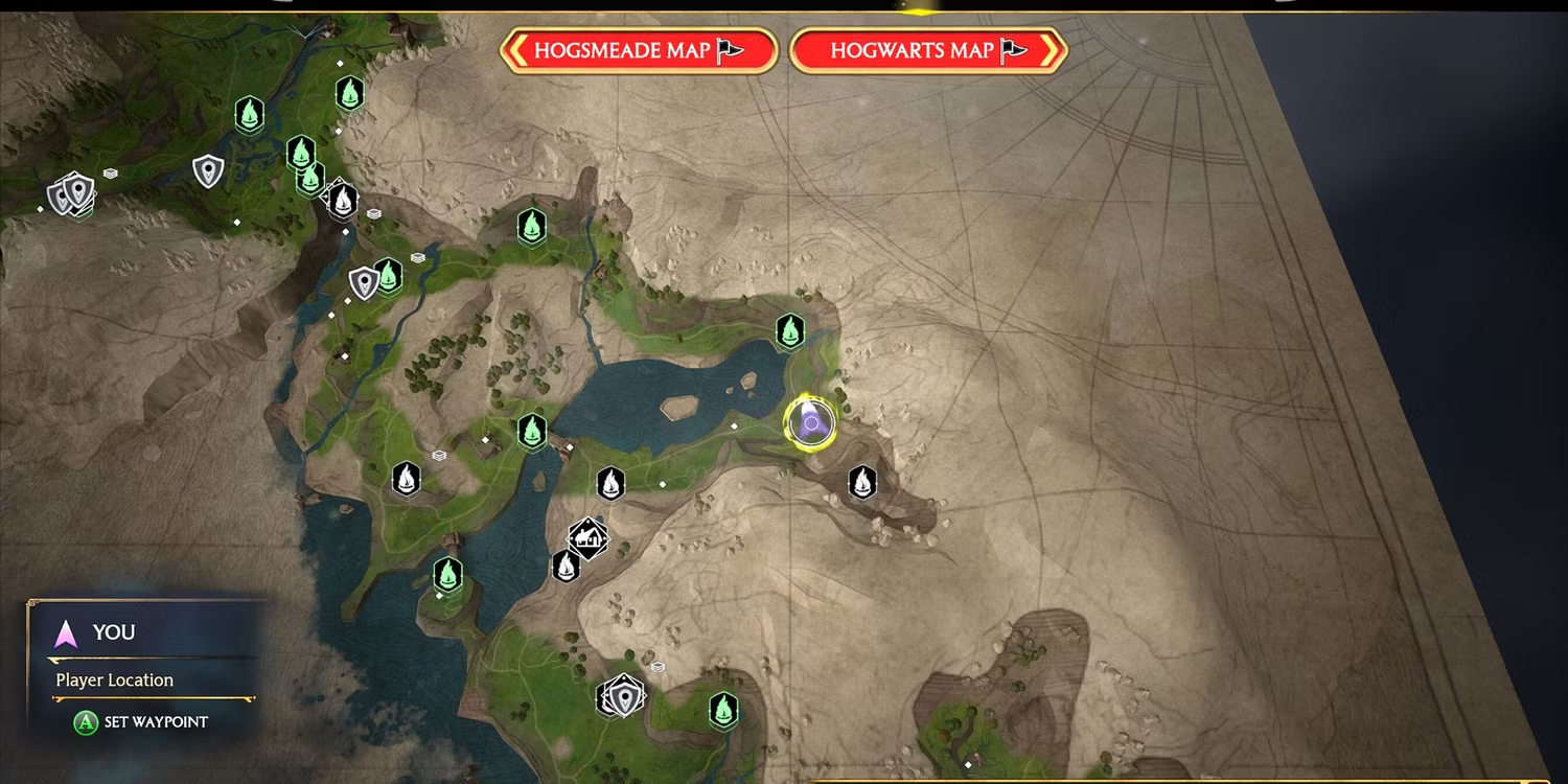 5. 금지된 숲 남서쪽, 동북 호그와트 지역 Floo Flame 서쪽 , 작은 산적 캠프 바로 남쪽의 강에 가까운 언덕. 저 멀리 호그와트 성이 보인다.
