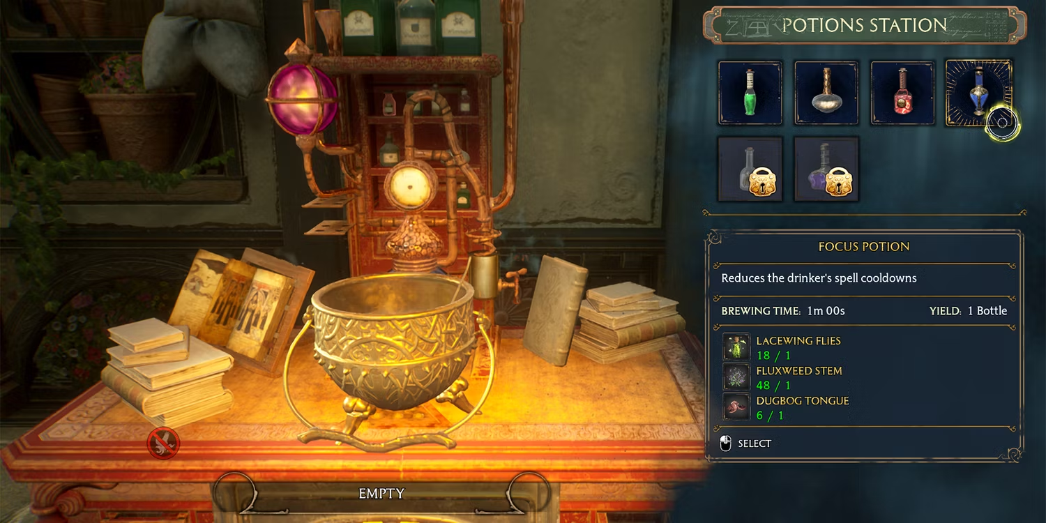 또한 플레이어가 직접 물약을 만들고 싶다면 J. Pippin의 물약 상점에서 레시피를 찾을 수 있지만 Focus Potion 레시피가 1,200 갈레온이므로 매우 비쌉니다.