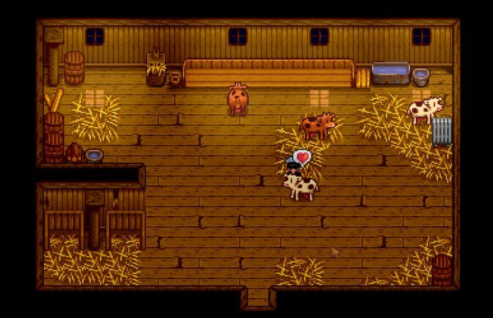 이 지식을 바탕으로 외부에서 잔디가 자라는지 확인하고 필요한 경우 몇 개의 잔디 스타터 키트(Pierre's에서 100G에 구입) 주위에 펼쳐서 퍼뜨립니다. 그들은 하루에 한 타일을 먹을 것입니다. 풀이 헛간에서 멀리 떨어져 있으면 소가 굶주릴 수 있습니다. 잔디가 있는 지역에서 동물을 울타리를 쳐서 그들이 찾을 수 있도록 합니다. 돌아다니기에 충분하고 매일 줄어들지 않는지 확인하십시오. 더 넓은 들판은 풀이 더 많이 퍼지게 할 것이며 겨울 직전에 낫으로 제거할 수 있습니다(주변의 다른 모든 풀과 함께). 매일 저녁 소들은 스스로 외양간으로 돌아갑니다. 밤에 잠자리에 들기 전에 헛간 문을 닫지 않으면 또 다른 벌칙을 받게 됩니다. 이 모든 일을 매일 하면 심장 수치가 점차 높아질 것입니다. 그렇게 하지 않으면 약간의 페널티가 부과됩니다.